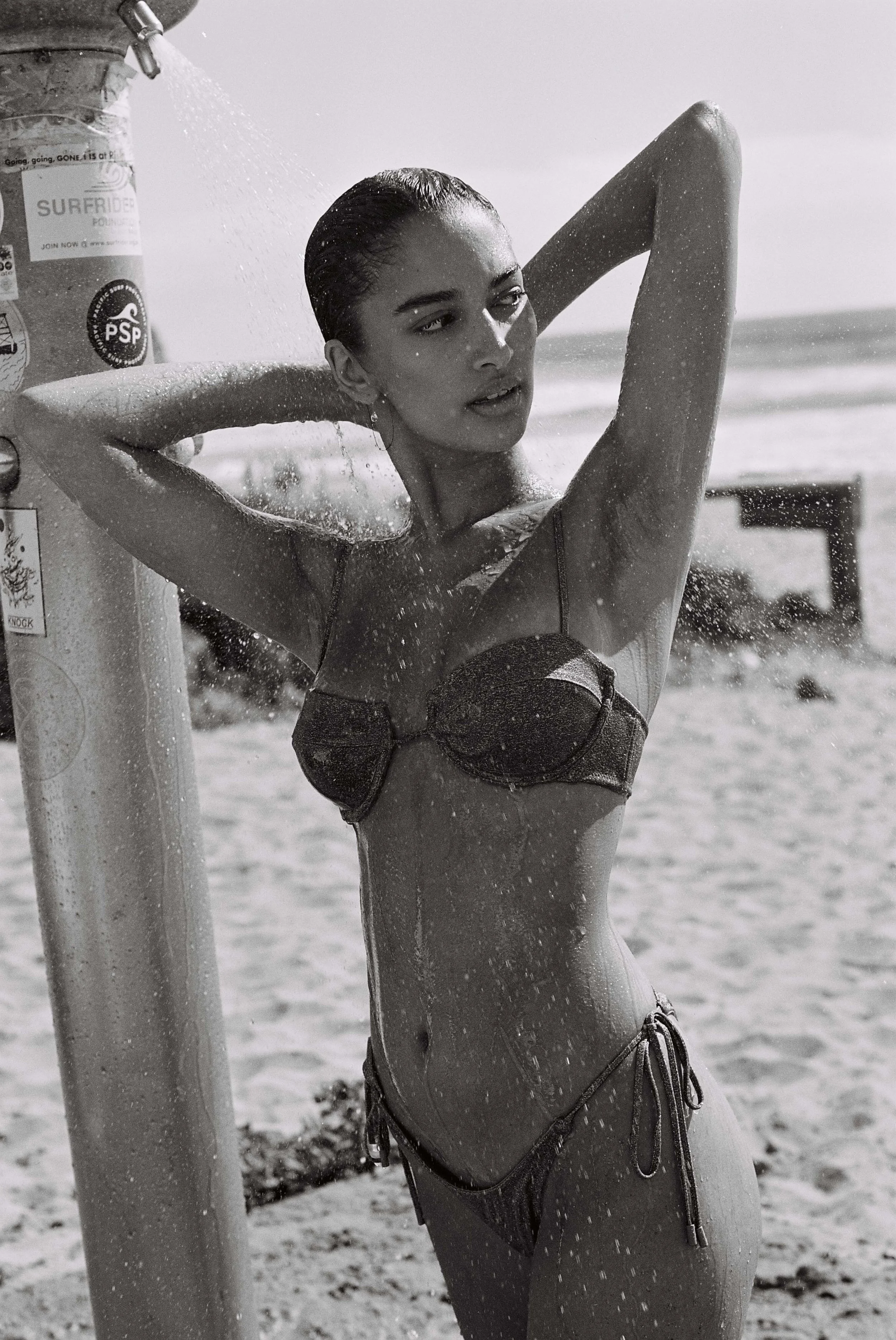 The shoot started with soft, golden light at Turimetta, capturing Kushi in a vibrant yellow one-piece from Gooseberry Swim. Later, we moved to nearby Warriewood Beach, where the break offered a calmer spot for swimming and dynamic water shots. For this segment, Kushi wore a green bikini from Triangl, a brand she regularly collaborates with.